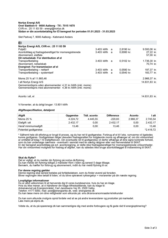 På side to finder du en udspecificeret regning, hvor du kan se de forskellige poster, som din samlede elpris består af, samt hvilke interessenter du betaler til via din elregning.