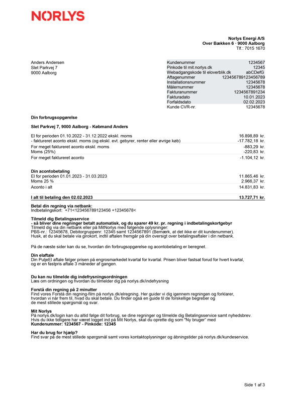 Regningens første side indeholder desuden dit kundenummer samt din pinkode, som du skal bruge for at kunne logge på Mit Norlys.