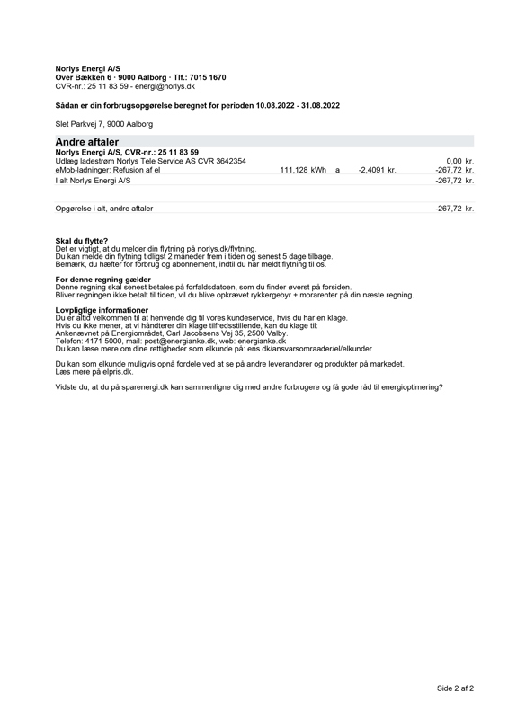 På din regning kan du under "Andre aftaler" se, hvor meget strøm du har anvendt på opladning af din bil, og dermed hvor meget refusion du får retur for elafgiften.