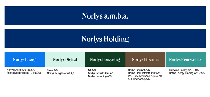 Norlys er en andelsejet energi- og telekoncern, som er organiseret i fire divisioner med hver sin ledelse og bestyrelse. Norlys-koncernen ejer desuden Stofa A/S, som placeret under Norlys Digital, og Netselskabet N1, som ligger i Norlys Forsyning samt 50 procent af Eurowind Energy, som ligger i Norlys Renewables.